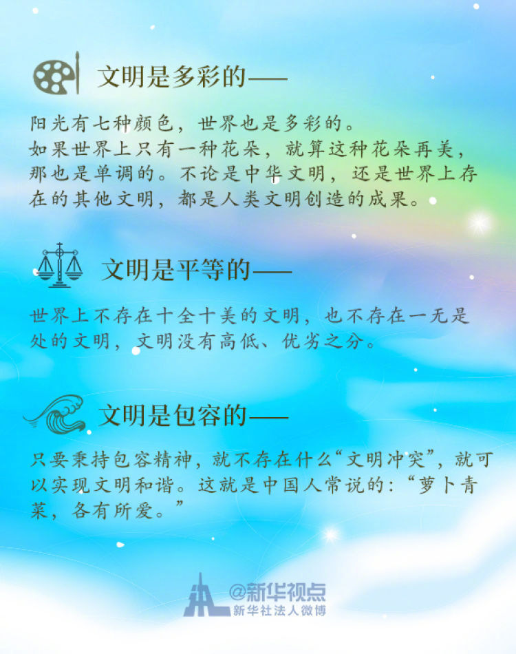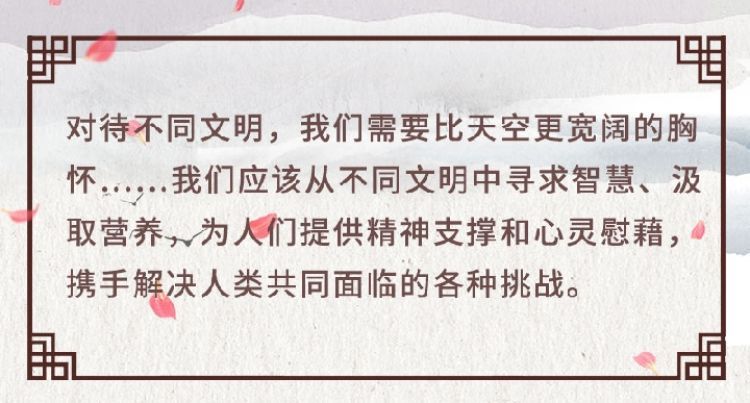 在这次演讲中,习近平主席用生动的语言讲明了对待不同文明应有的态度和原则: