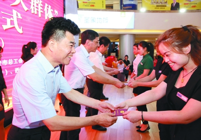 仪式现场,西安市总工会对持续推进“八大群体”入会进行了部署,入会会员代表进行了宣誓,与会领导为新入会会员代表颁发了《中国工会会员证》和爱心大礼包。红星美凯龙新入会会员代表贾鹏飞和西安国美电器工会主席李芳芳分别作表态发言。省市区三级总工会还为新会员们准备了系列服务项目,向红星美凯龙、国美电器两大商家提供了200份免费体检单,向其职工活动室赠送了液晶电视、购书款,体检项目将由西安工会医院提供免费上门服务。