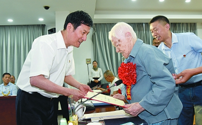 郭大为(左一)向石先同志颁发光荣证(本报记者 刘强 摄)