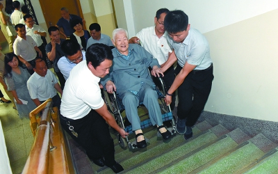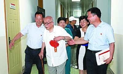 老党员走到哪里都有工会干部的搀扶