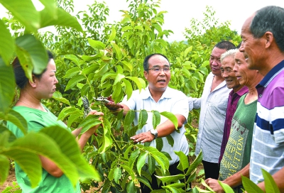 8月5日,盛鑫红仁核桃专业合作社总经理董兆斌(左二)在洛南县景村镇八一村红仁核桃示范基地为合作社成员讲解夏季田间管理技术。