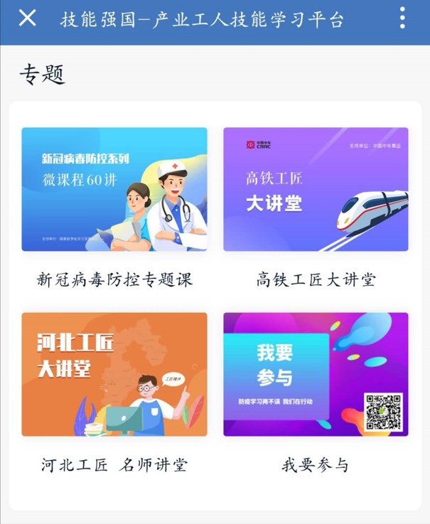 国家发改委、人社部、工信部、全总等四部门于2月5日联合印发了《关于应对新型冠状病毒感染肺炎疫情 支持鼓励劳动者参与线上职业技能培训的通知》,从六个方面支持鼓励劳动者参与线上职业技能培训,进一步提升劳动者素质和技能水平,助力打赢疫情防控阻击战。根据通知要求,疫情期间,依托“技能强国—全国产业工人技能学习平台”(PC端:skills.kjcxchina.com,移动端:skills.kjcxchina.com/m)等平台,对劳动者实行重点课程免费开放。