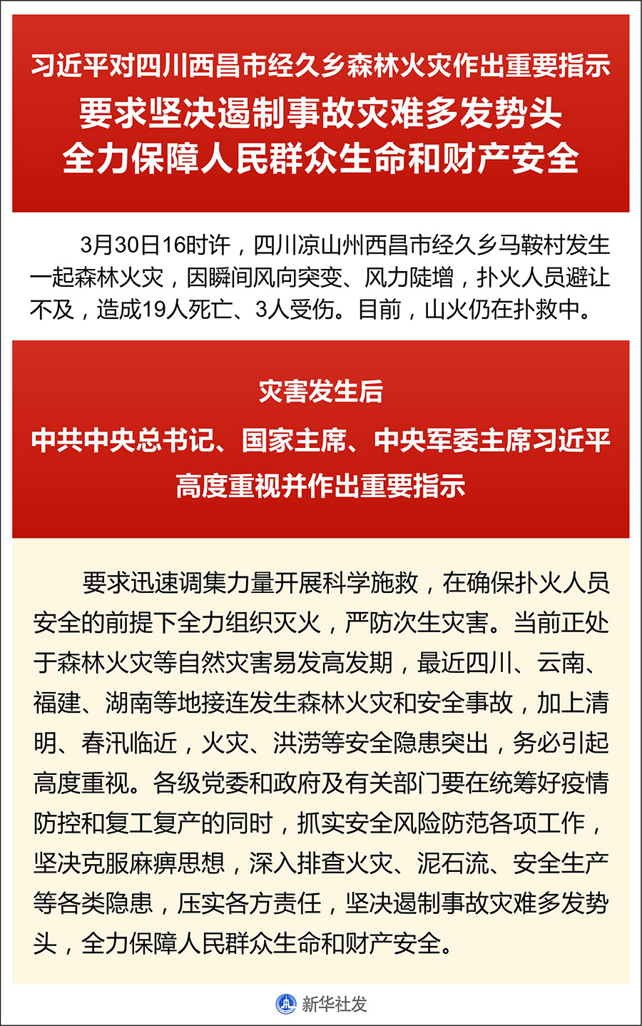 灾害发生后,中共中央总书记、国家主席、中央军委主席习近平高度重视并作出重要指示,要求迅速调集力量开展科学施救,在确保扑火人员安全的前提下全力组织灭火,严防次生灾害。当前正处于森林火灾等自然灾害易发高发期,最近四川、云南、福建、湖南等地接连发生森林火灾和安全事故,加上清明、春汛临近,火灾、洪涝等安全隐患突出,务必引起高度重视。各级党委和政府及有关部门要在统筹好疫情防控和复工复产的同时,抓实安全风险防范各项工作,坚决克服麻痹思想,深入排查火灾、泥石流、安全生产等各类隐患,压实各方责任,坚决遏制事故灾难多发势头,全力保障人民群众生命和财产安全。
