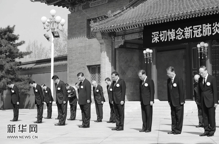 4月4日上午10时,习近平、李克强、栗战书、汪洋、王沪宁、赵乐际、韩正、王岐山等党和国家领导人在中南海怀仁堂前,同全国各地各族人民一起,向抗击新冠肺炎疫情斗争牺牲烈士和逝世同胞默哀。 新华社记者 庞兴雷 摄