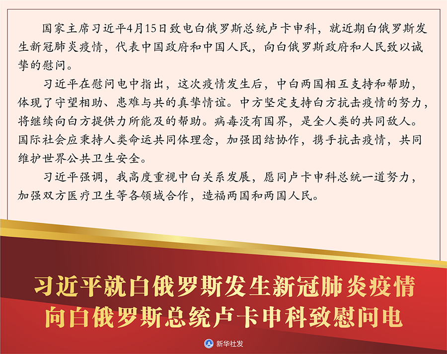 国家主席习近平4月15日致电白俄罗斯总统卢卡申科,就近期白俄罗斯发生新冠肺炎疫情,代表中国政府和中国人民,向白俄罗斯政府和人民致以诚挚的慰问。