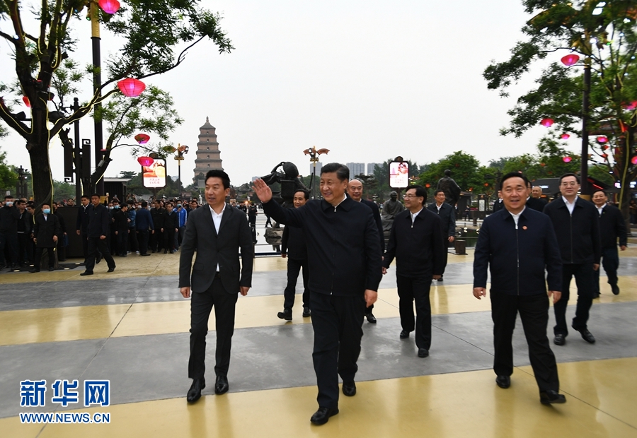 傍晚时分,习近平乘车来到毗邻大雁塔的大唐不夜城步行街。疫情发生以来,昔日熙熙攘攘的步行街一度空荡无人,现在又开始热闹起来。习近平走进步行街,了解步行街恢复经营状况。沿途游客看见总书记,惊喜地欢呼起来,习近平频频挥手致意。他走进老字号西安饭庄,同店员和正在就餐的顾客热情交谈。习近平强调,要在科学防控疫情的前提下,有序推动各类商场、市场复商复市,努力恢复正常生活秩序。