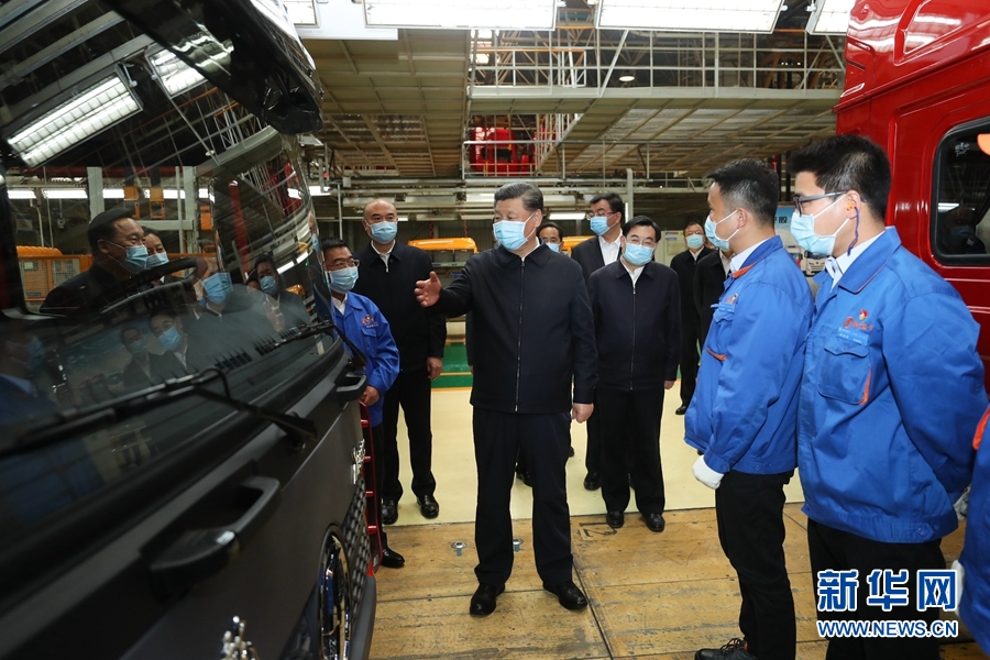 22日,习近平在西安考察复工复产和经济社会恢复运行等情况。陕西汽车控股集团有限公司是西北地区有影响力的制造企业。习近平详细了解产品研发、生产、销售和复工复产情况,对他们克服疫情影响创产销历史新高表示赞赏。总装车间内一片繁忙景象。习近平察看内饰生产线、总装配生产线,饶有兴致登上装配完成的民用重型卡车驾驶室,向技术人员询问产品性能和操作流程。习近平强调,制造业是国家经济命脉所系。国有大型企业要发挥主力军作用,在抓好常态化疫情防控的前提下,带动上下游产业和中小企业全面复工复产。习近平指出,新时代陕西要有勇立潮头、争当时代弄潮儿的志向和气魄,既要抓住西部大开发、共建“一带一路”等重大机遇,又要善于从眼前的危机和挑战中抢抓和创造机遇,不断发展新模式、新业态、新技术、新产品,创造新的更大业绩,迈上新的台阶。