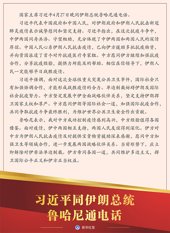 习近平代表中国政府和中国人民,对伊朗政府和伊朗人民抗击新冠肺炎疫情表示诚挚慰问和坚定支持。习近平指出,在这次抗疫斗争中,中伊两国同舟共济、守望相助,充分体现了中伊两国和两国人民的深情厚谊。中国人民心系伊朗人民抗击疫情,已向伊方援助多批抗疫物资,并向贵国派遣了首个对外抗疫医疗专家组。中方愿同伊方继续加强抗疫合作,分享抗疫经验,提供力所能及的帮助。相信在你领导下,伊朗人民一定能够早日战胜疫情。