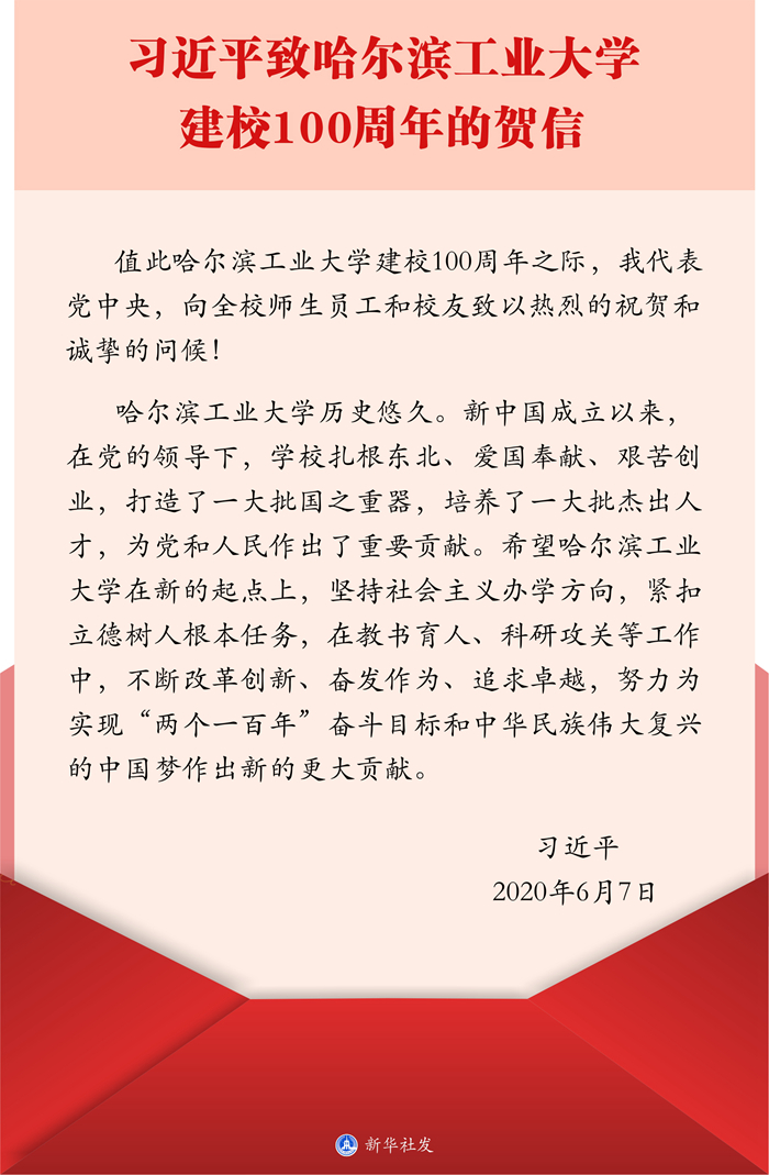 中共中央总书记、国家主席、中央军委主席习近平7日致信祝贺哈尔滨工业大学建校100周年,向全校师生员工和校友致以热烈的祝贺和诚挚的问候。