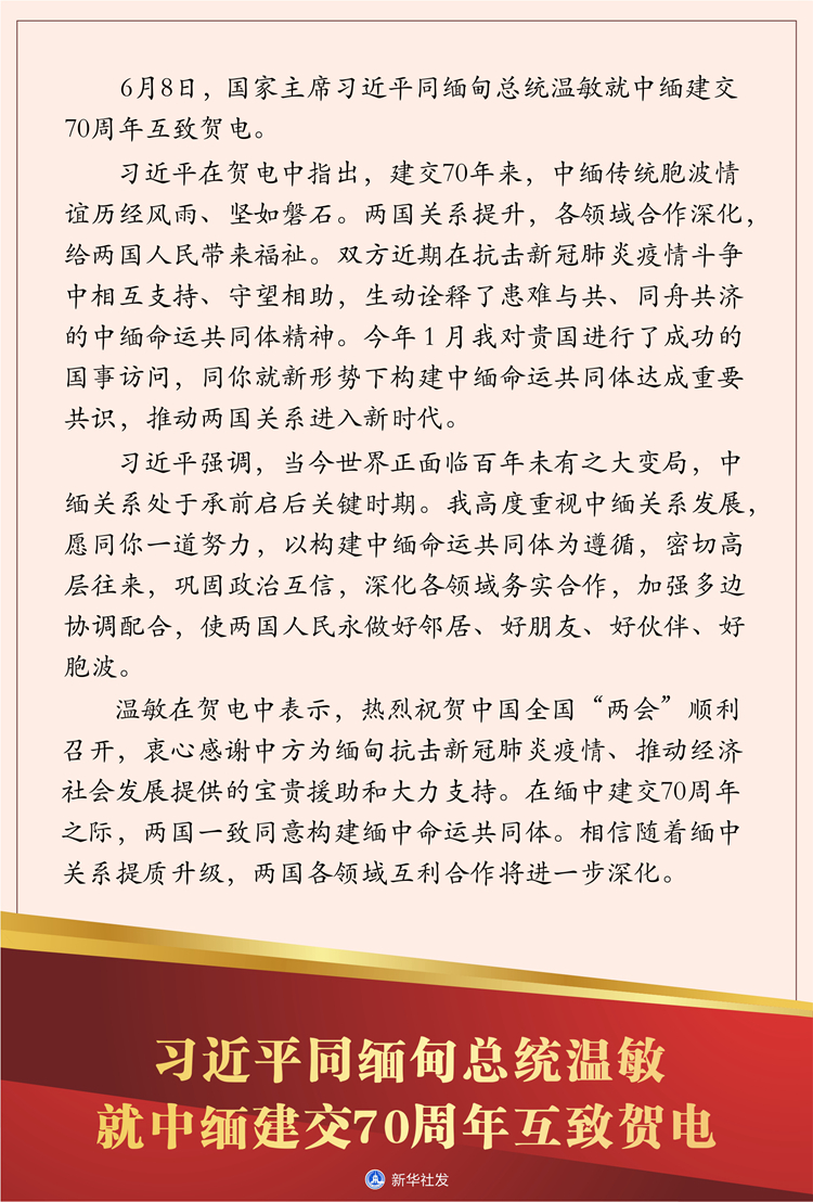 6月8日,国家主席习近平同缅甸总统温敏就中缅建交70周年互致贺电。