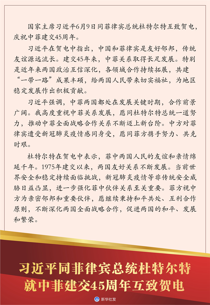 国家主席习近平6月9日同菲律宾总统杜特尔特互致贺电,庆祝中菲建交45周年。
