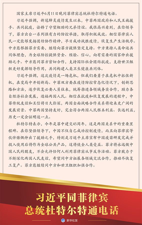国家主席习近平6月11日晚同菲律宾总统杜特尔特通电话。
