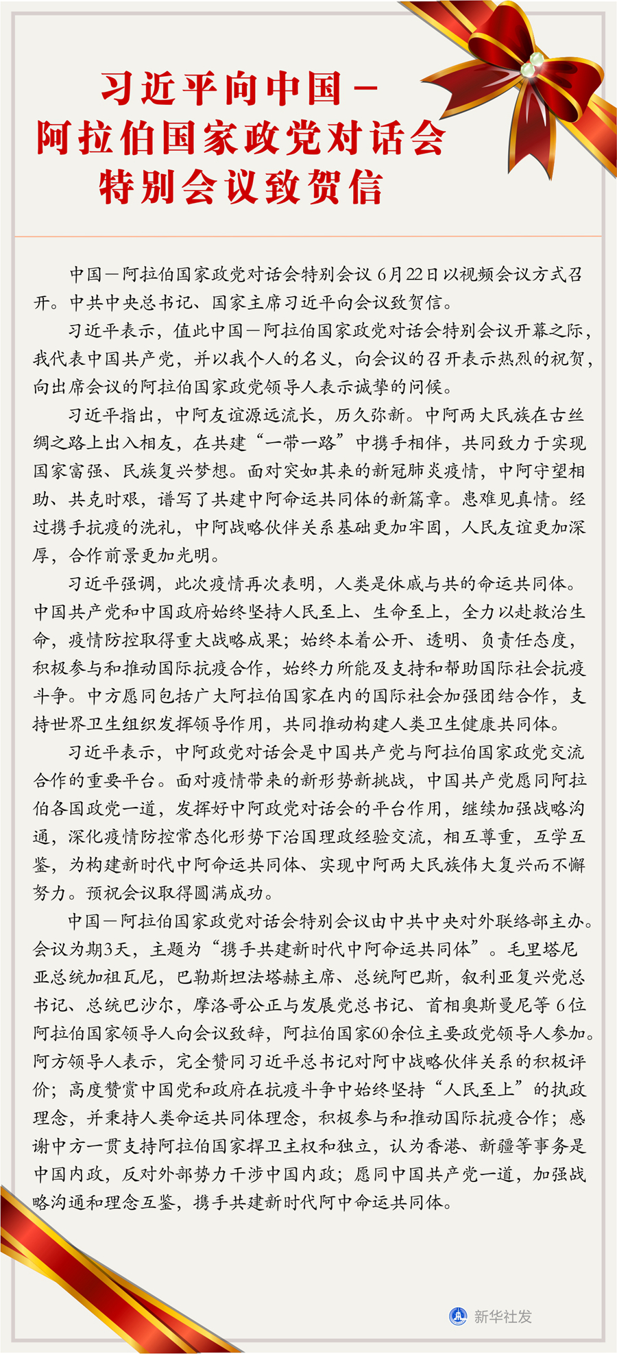 中国-阿拉伯国家政党对话会特别会议22日以视频会议方式召开。中共中央总书记、国家主席习近平向会议致贺信。