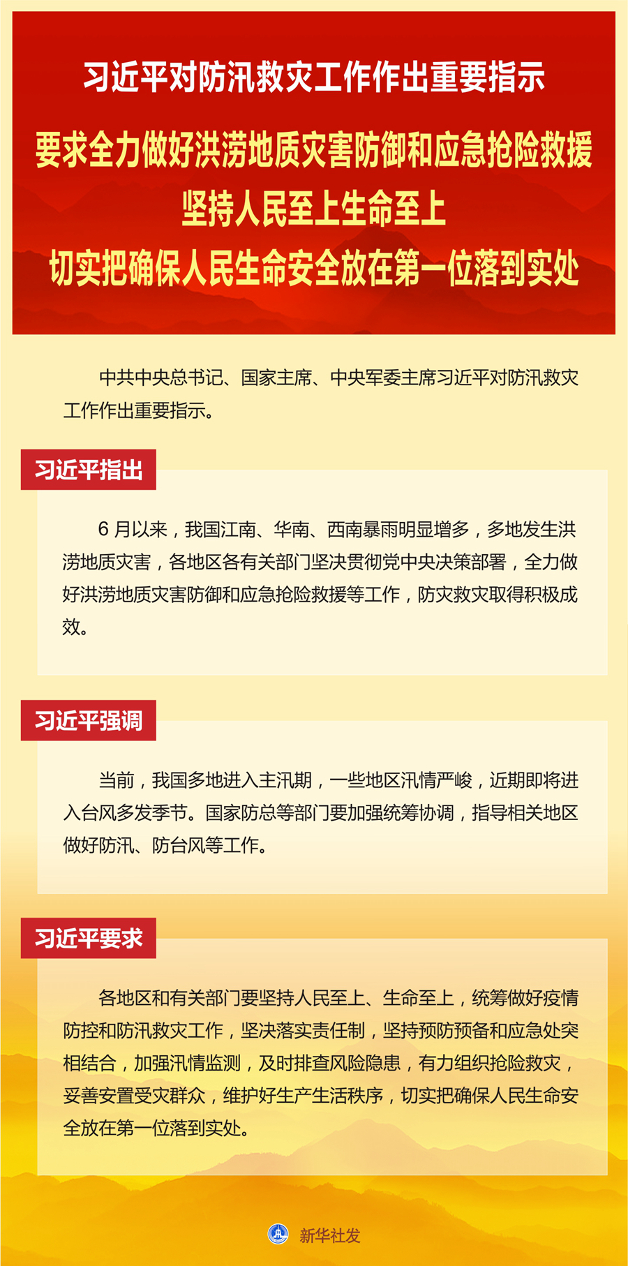 习近平要求,各地区和有关部门要坚持人民至上、生命至上,统筹做好疫情防控和防汛救灾工作,坚决落实责任制,坚持预防预备和应急处突相结合,加强汛情监测,及时排查风险隐患,有力组织抢险救灾,妥善安置受灾群众,维护好生产生活秩序,切实把确保人民生命安全放在第一位落到实处。