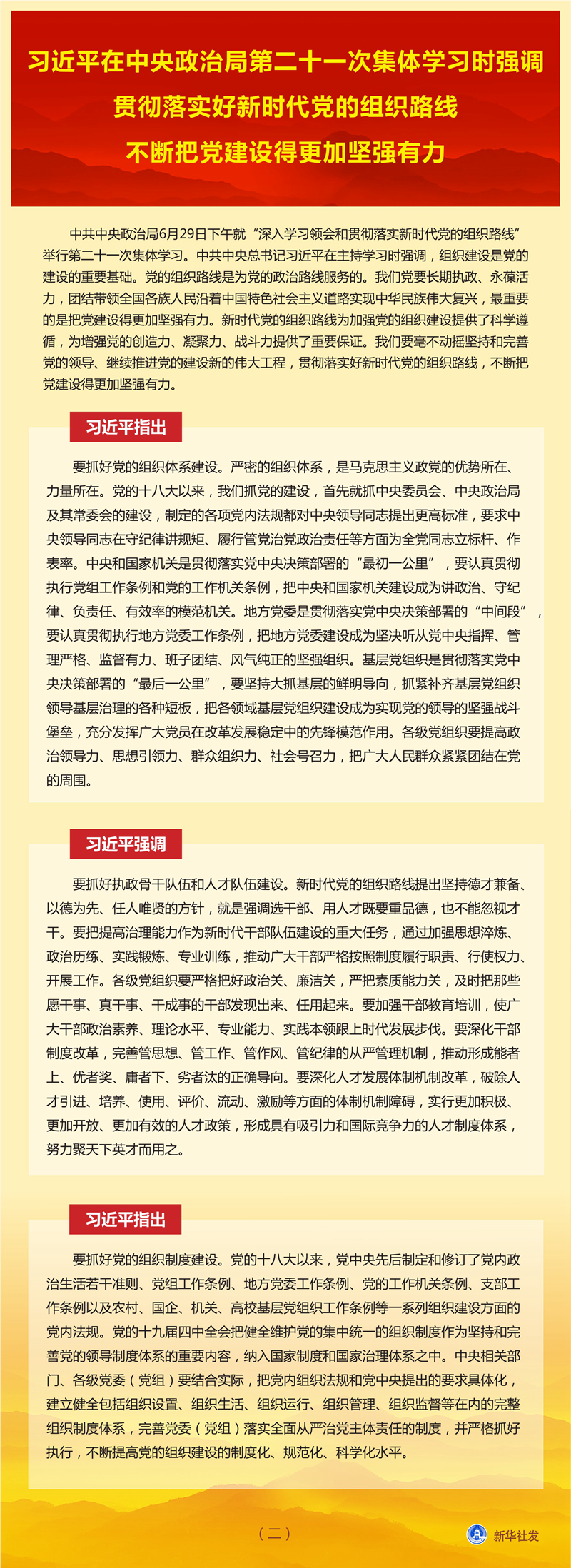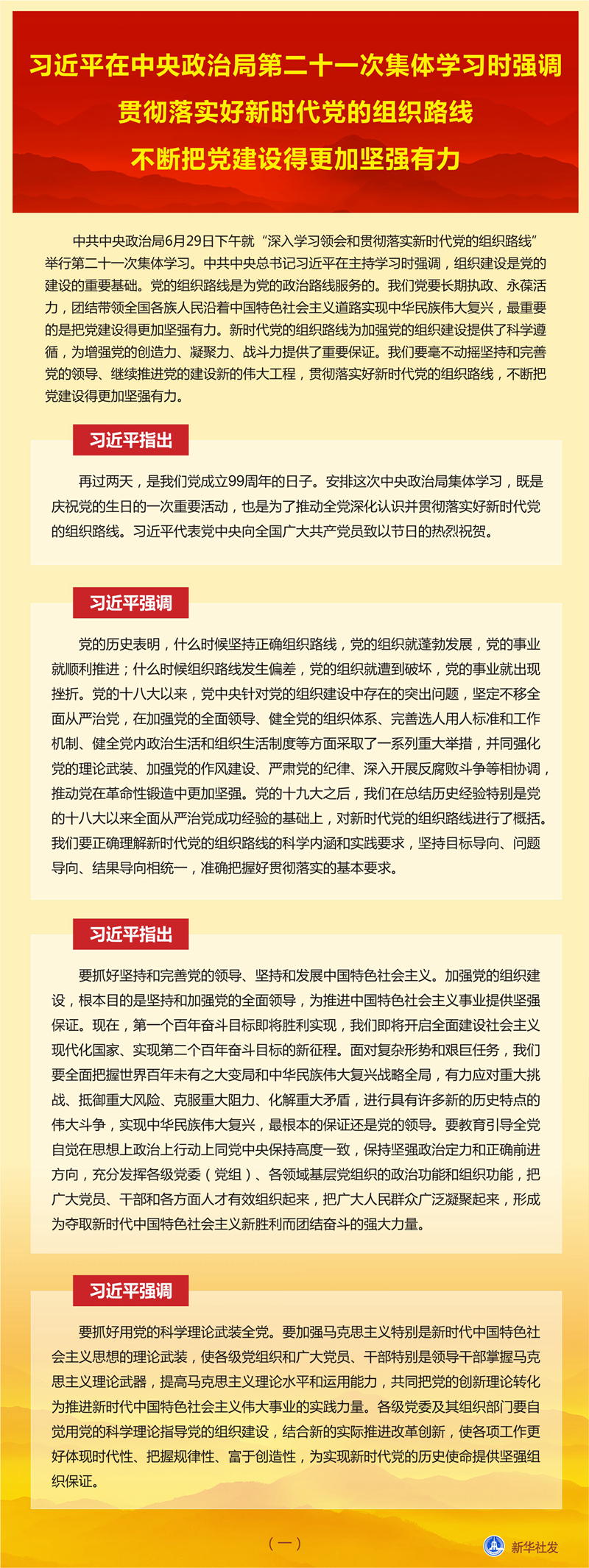 中共中央政治局6月29日下午就“深入学习领会和贯彻落实新时代党的组织路线”举行第二十一次集体学习。中共中央总书记习近平在主持学习时强调,组织建设是党的建设的重要基础。党的组织路线是为党的政治路线服务的。我们党要长期执政、永葆活力,团结带领全国各族人民沿着中国特色社会主义道路实现中华民族伟大复兴,最重要的是把党建设得更加坚强有力。新时代党的组织路线为加强党的组织建设提供了科学遵循,为增强党的创造力、凝聚力、战斗力提供了重要保证。我们要毫不动摇坚持和完善党的领导、继续推进党的建设新的伟大工程,贯彻落实好新时代党的组织路线,不断把党建设得更加坚强有力。