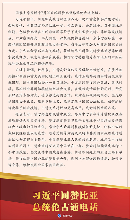 国家主席习近平7月20日晚同赞比亚总统伦古通电话。