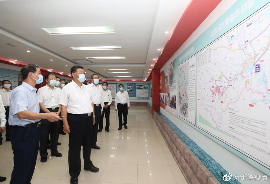 习近平总书记18日赴安徽考察调研。当天下午,他先后来到阜阳市阜南县王家坝闸、红亮箱包有限公司、蒙洼蓄洪区曹集镇利民村西田坡庄台,察看淮河水情,走进田间地头,了解当地防汛救灾和灾后恢复生产等情况,看望慰问受灾群众。 (文字记者:张晓松 摄影记者:鞠鹏 王晔)