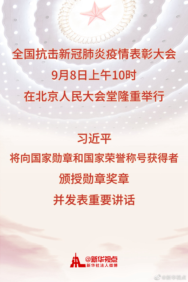 全国抗击新冠肺炎疫情表彰大会将于9月8日上午10时在北京人民大会堂隆重举行。中共中央总书记、国家主席、中央军委主席习近平将向国家勋章和国家荣誉称号获得者颁授勋章奖章并发表重要讲话。