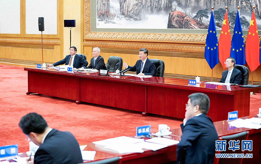 国家主席习近平14日晚在北京同欧盟轮值主席国德国总理默克尔、欧洲理事会主席米歇尔、欧盟委员会主席冯德莱恩共同举行会晤,会晤以视频方式举行。中德欧领导人就中欧关系深入交换意见,为下阶段中欧关系规划方向,确定重点领域,一致同意加强沟通协调合作,确保今后中欧之间一系列重大政治议程取得成功,深化互信,实现互利共赢,坚持维护多边主义,共同应对全球性挑战,推动中欧关系迈向更高水平。中欧双方宣布签署《中欧地理标志协定》,确认加快中欧投资协定谈判,实现年内完成谈判的目标。中欧决定建立环境与气候高层对话和数字领域高层对话,打造中欧绿色合作伙伴、数字合作伙伴关系。