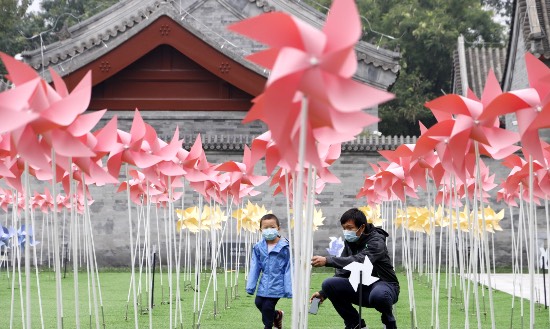 景区装点的风车吸引着孩子的注意。人民网 鄂智超 摄