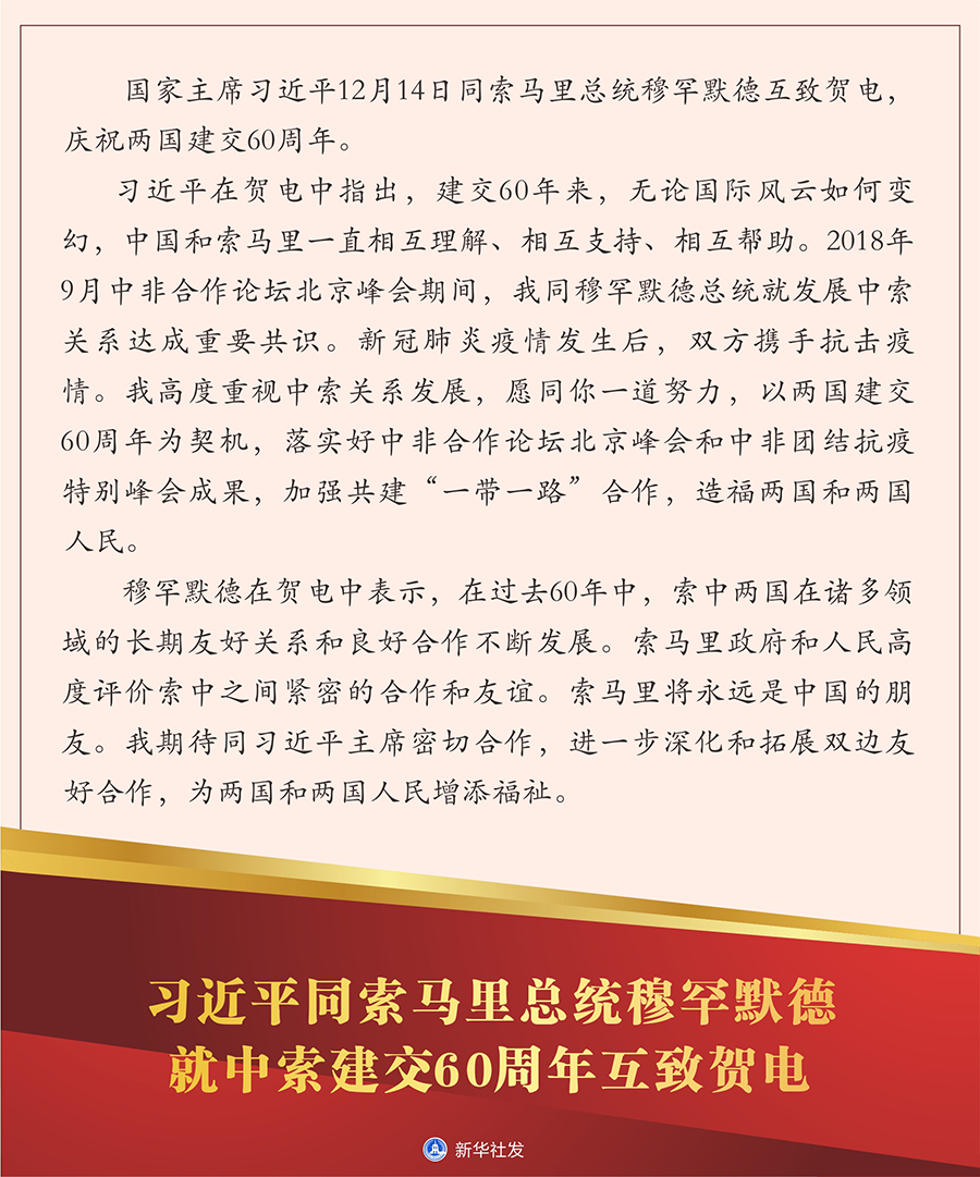 国家主席习近平12月14日同索马里总统穆罕默德互致贺电,庆祝两国建交60周年。
