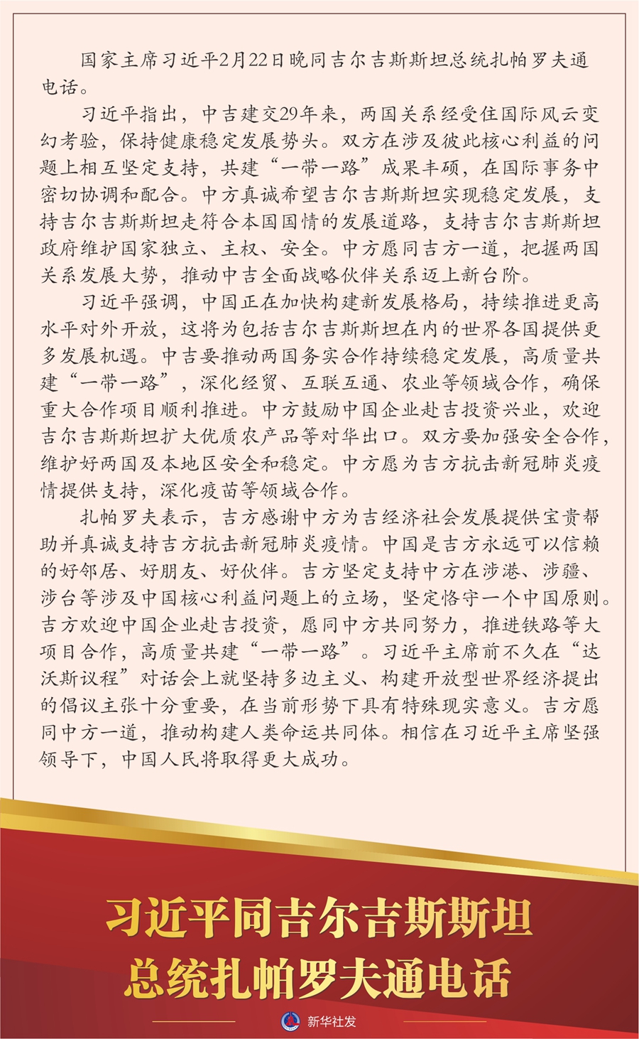国家主席习近平2月22日晚同吉尔吉斯斯坦总统扎帕罗夫通电话。