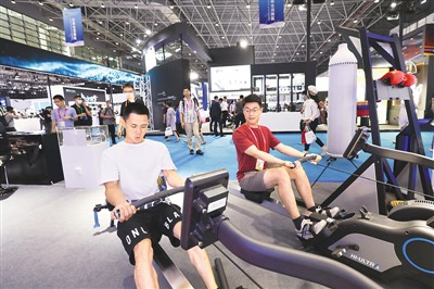 5月7日,观众在消博会现场体验划船机。