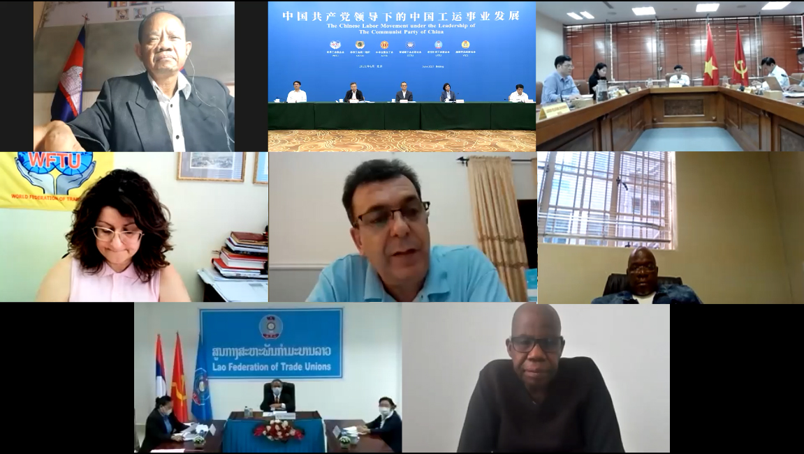 中工网北京6月23日电(记者 王鑫)为庆祝中国共产党成立100周年,由中华全国总工会主办的“中国共产党领导下的中国工运事业发展”多边交流会,6月23日以视频形式举办。来自世界工会联合会、非洲工会统一组织,以及越南、老挝、柬埔寨等外国工会组织领导人出席会议,祝贺中国共产党建党100周年,盛赞一个世纪以来中国共产党带领中国人民取得的伟大成就。