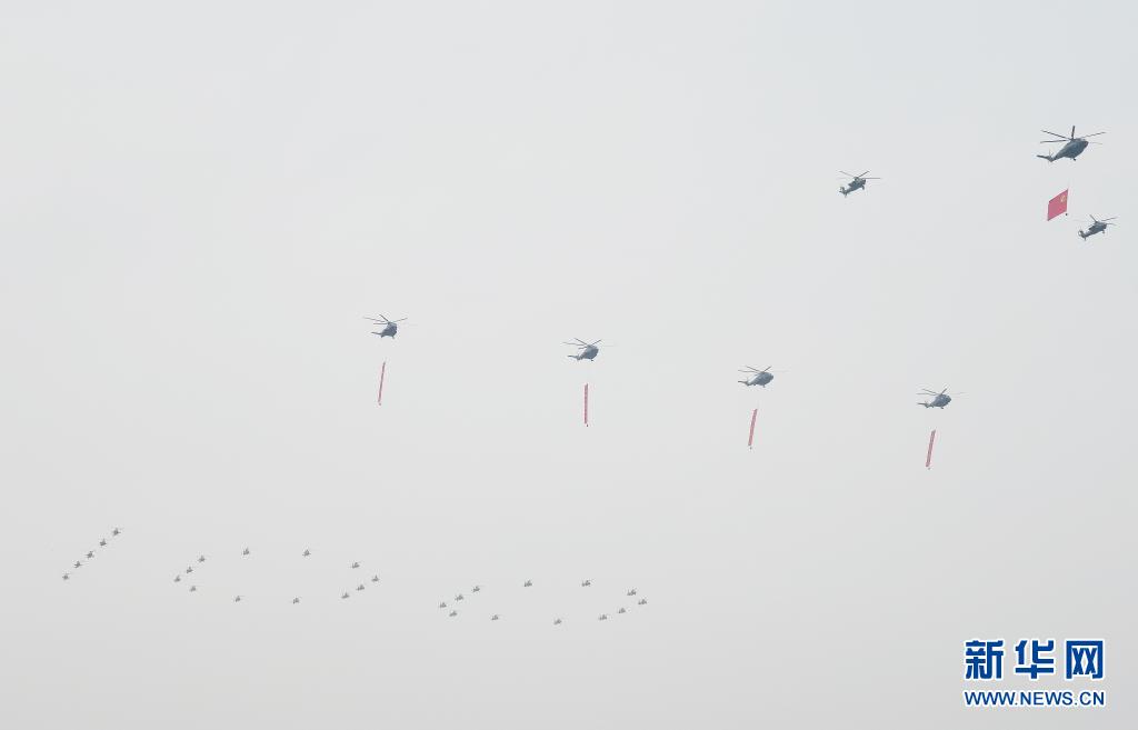 4架运输直升机,悬挂着4面巨幅标语紧随其后——“伟大的中国共产党万岁”“伟大的中国人民万岁”“伟大的中华人民共和国万岁”“全国各族人民大团结万岁”。