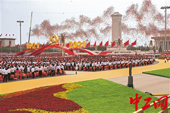 8点整,大会正式开始。鸣礼炮、升国旗、唱国歌。王达一边看着电视,一边挥舞着手中的党旗和国旗。此刻,大家仿佛置身于天安门广场之中,与首都人民一起欢庆。