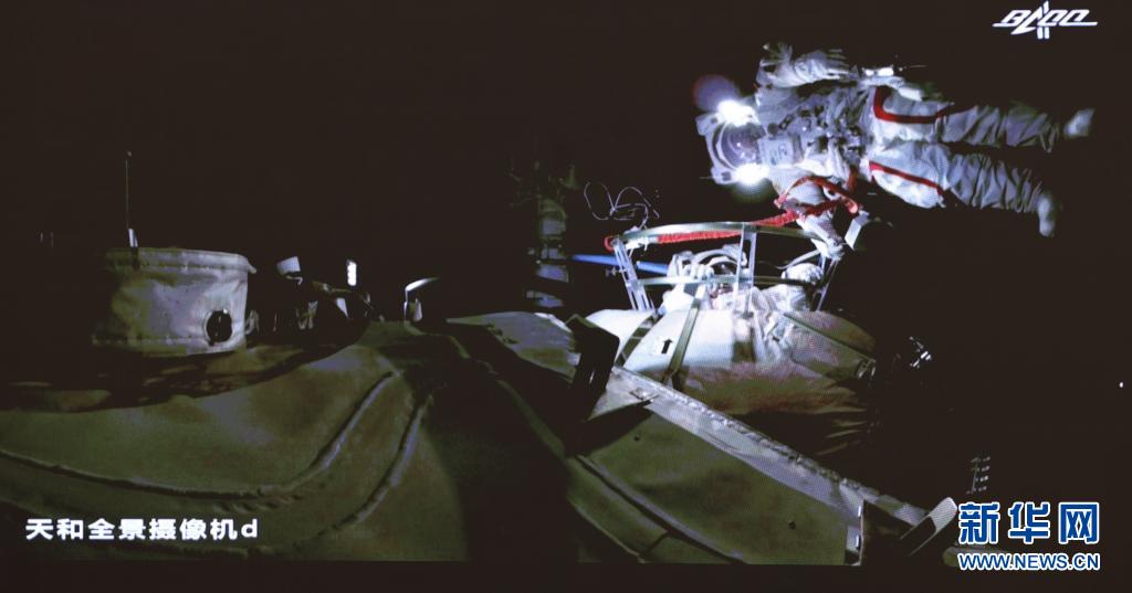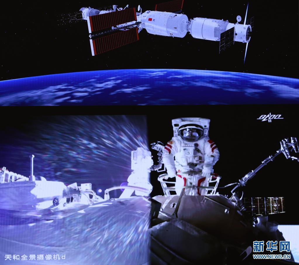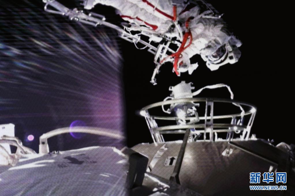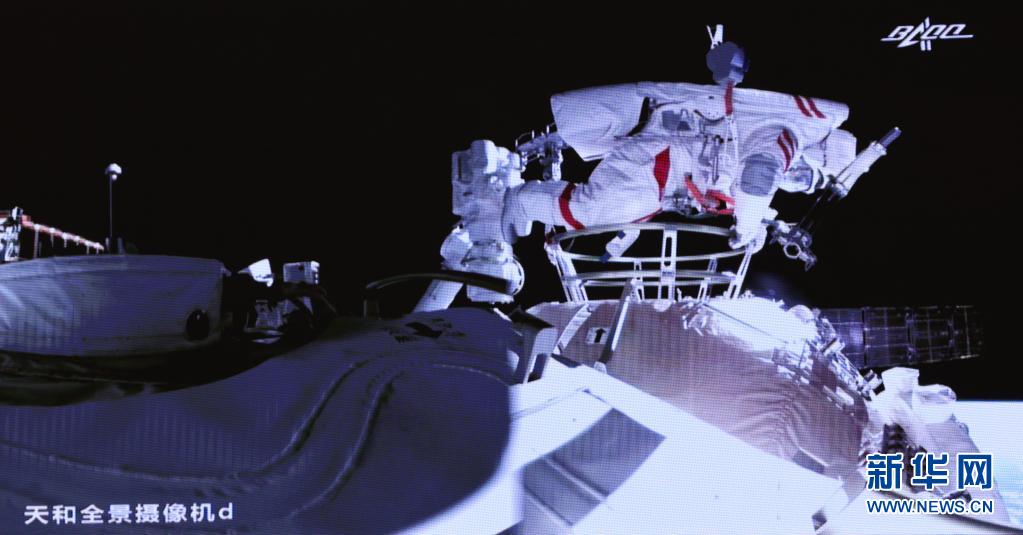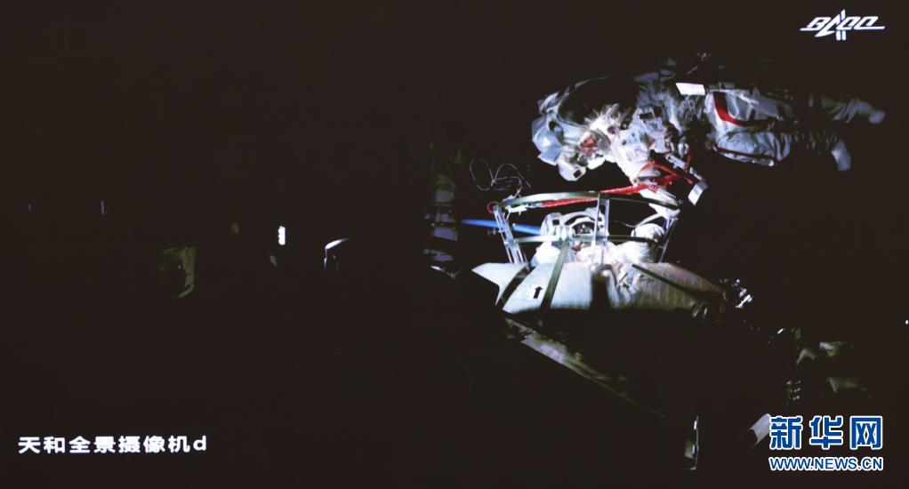 7月4日,在北京航天飞行控制中心大屏拍摄的航天员在舱外工作场面。新华社记者 金立旺 摄
