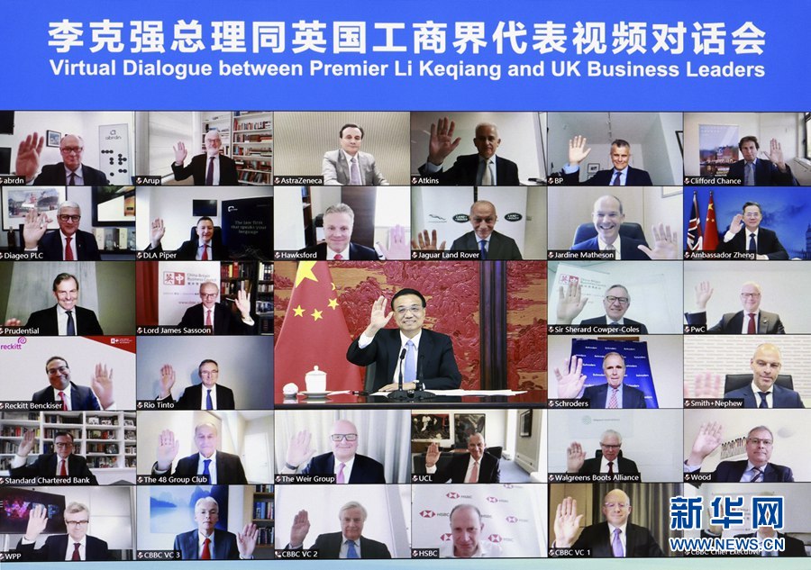 新华社北京7月6日电 国务院总理李克强7月6日下午在中南海紫光阁同英国工商界代表举行视频对话会,围绕中英关系与务实合作、新冠肺炎疫情、应对气候变化、优化营商环境、深化服务贸易合作、促进人文交流等议题进行对话交流。标准人寿、帝亚吉欧、怡和、阿斯利康、沃博联、英国石油、力拓集团、捷豹路虎、高伟绅律师事务所、施罗德集团、伦敦大学学院、英国48家集团俱乐部等30多家跨国公司和知名机构负责人出席。