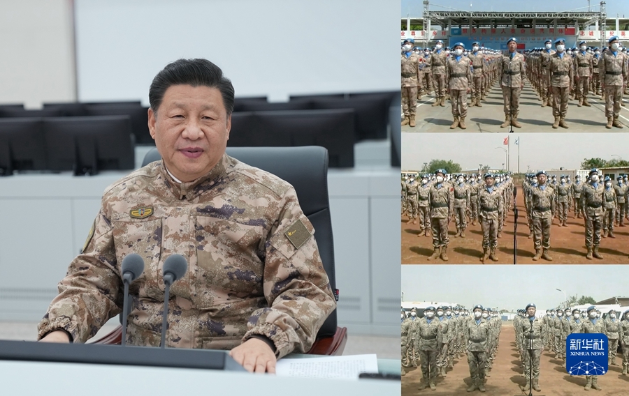 随后,习近平同中部战区海外维和分队进行视频通话。来自维和步兵营、工兵分队、医疗分队、直升机分队的同志们整齐列队,依次向习近平报告。习近平向他们,并向我军正在海外执行任务的全体官兵表示慰问。习近平强调,要忠实履行维和使命,为维护世界和平贡献更多中国力量,向世界展示中国军队良好形象。维和任务区环境复杂,要注意加强安全防范,搞好疫情防控。