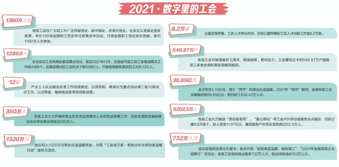2021年,悄然启动的两项活动,却在职工中引发了巨响——“工会进万家”调研走访慰问活动和全国工会系统机关干部赴基层蹲点活动。从一组数据可以看到活动产生的连锁反应:各省级总工会走访慰问劳模和工匠11万人,发放慰问金近亿元;全国省市县三级工会组成的蹲点工作组累计开展普惠服务惠及职工328.13万人,帮扶困难职工8.81万人,化解劳动关系纠纷涉及职工1.5万人,为职工提供法律援助涉及14.31万人。为了解决职工急难愁盼问题,为了实现职工对美好生活的向往,广大工会干部勇于探索、攻坚克难。