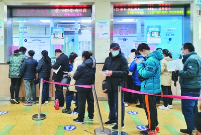 2月16日,在西安市人民医院(西安市第四医院)大差市院区门诊结算处,患者及家属排队等待办理相关手续。